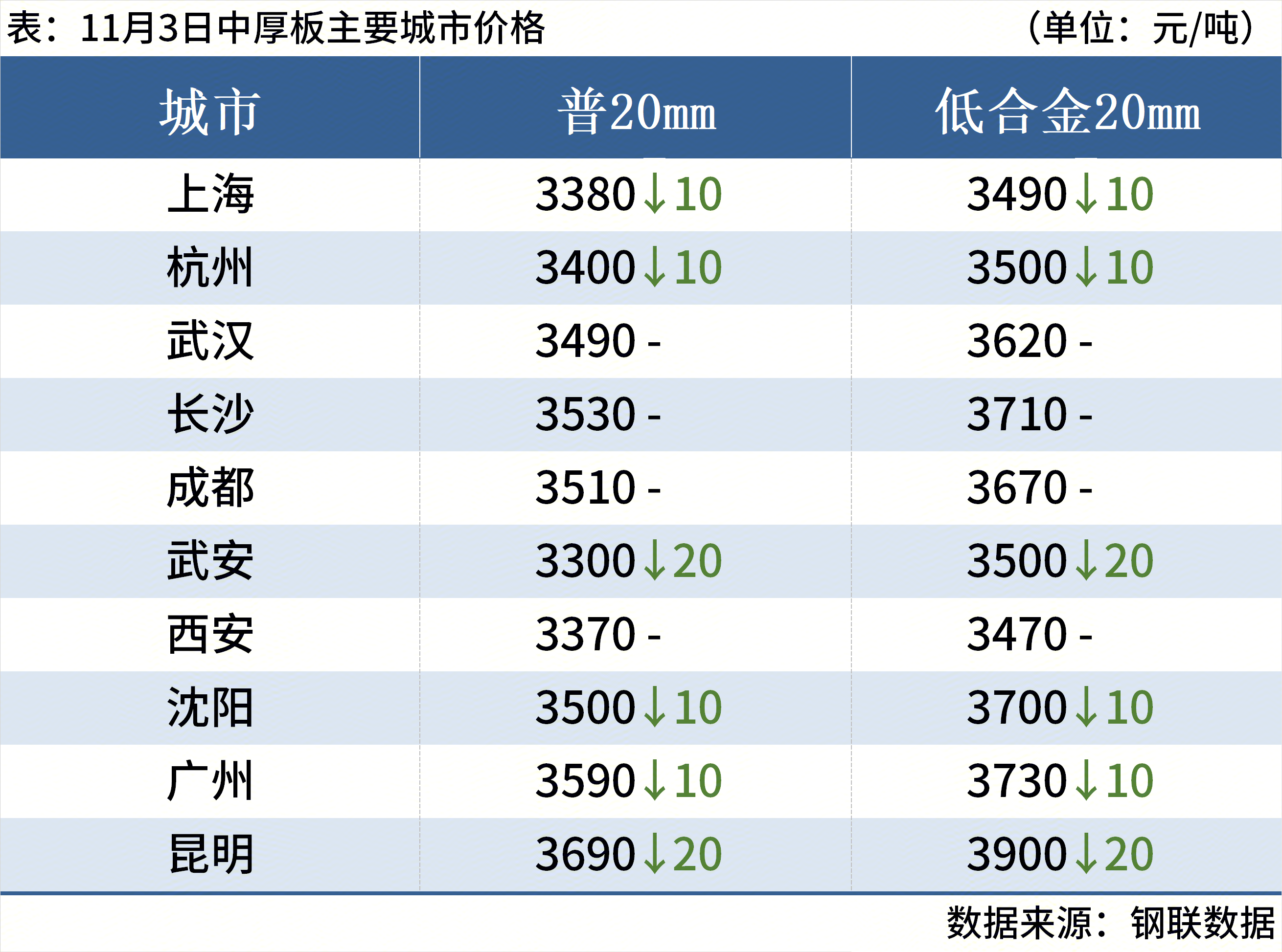 中厚板:11月3日,全国24个主要城市20mm普板均价3464元/吨,较上一交易日下跌8元/吨。市场交投氛围不佳,江阴武安等主要中厚板集散地库存较大,以出库为主,暗降资源较多。下游钢结构客户多以观望为主,采购量较小,其他终端客户市场与钢厂直接定轧较多,一定程度上影响了钢厂对市场流通材的投放速度。多数对后市中厚板看法依旧偏谨慎,目前以保持出货为主。预计4日中厚板价格窄幅震荡运行。