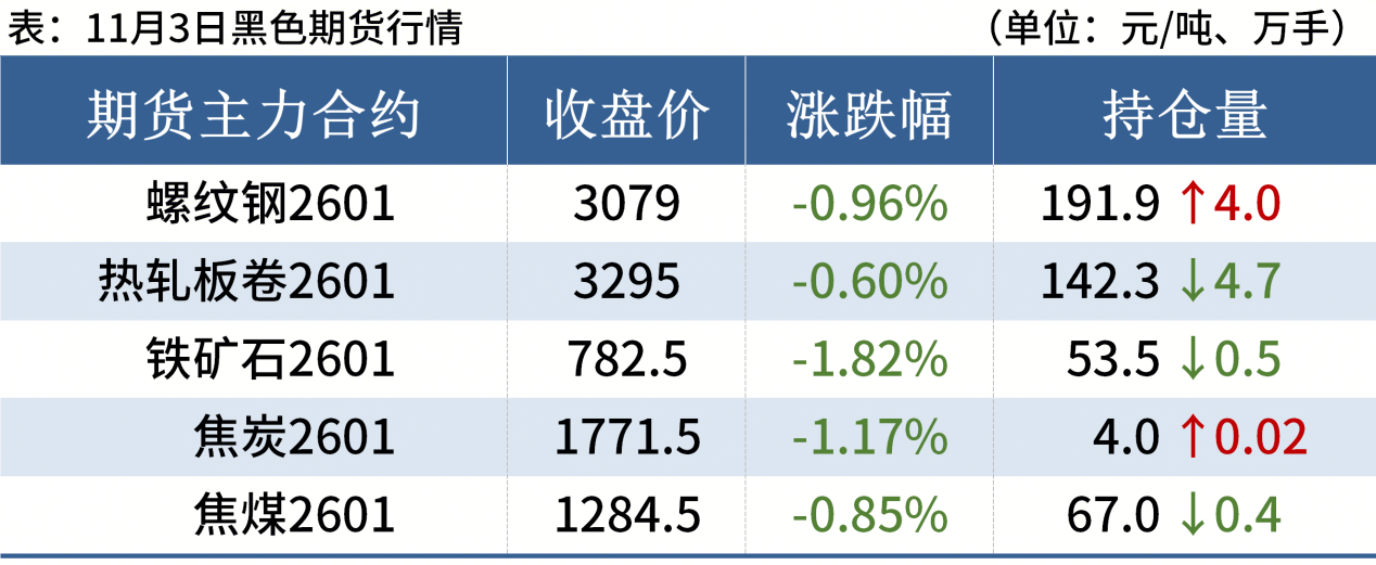 随着宏观利好消息逐步消化,房地产市场延续低位运行,叠加传统需求旺季进入尾声,11月初钢材需求难以继续回升,但仍维持一定韧性。同时,秋冬季北方重污染天气频发,高炉铁水产量有继续减少预期,对原燃料价格有一定抑制。短期来看,钢市供需两弱,成本有所下移,钢价或震荡偏弱。