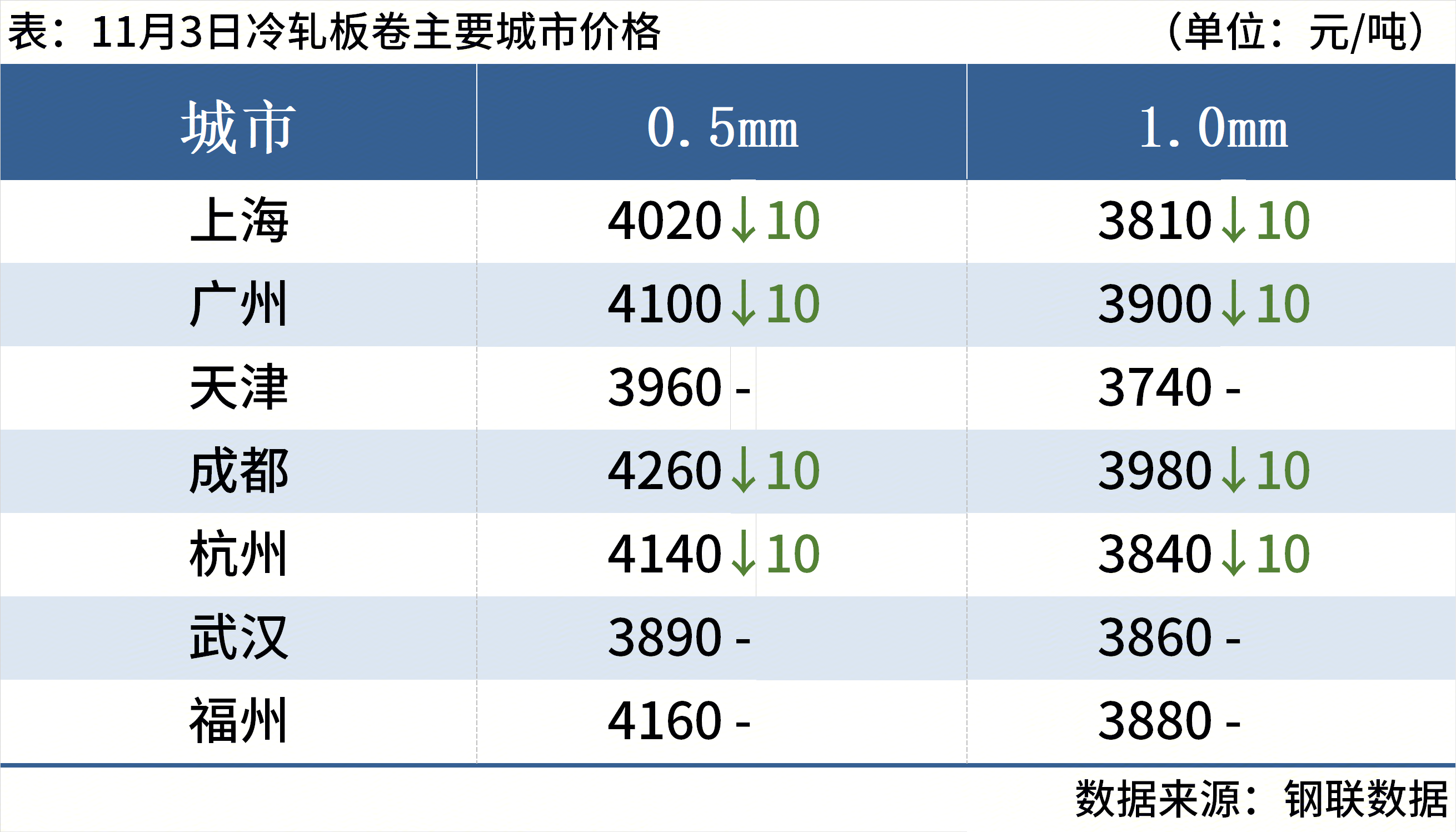 冷轧板卷:11月3日,全国24个主要城市1.0mm冷卷均价3930元/吨,较上一交易日下跌3元/吨。“金九银十”落幕,其需求释放不及市场预期,商户谨慎度增加;供应端来看,目前冷热价差较三季度走扩,生产企业仍有一定效益,整体供应仍维持相对高位,供需矛盾略有显现。预计4日全国冷轧板卷价格弱稳运行为主。