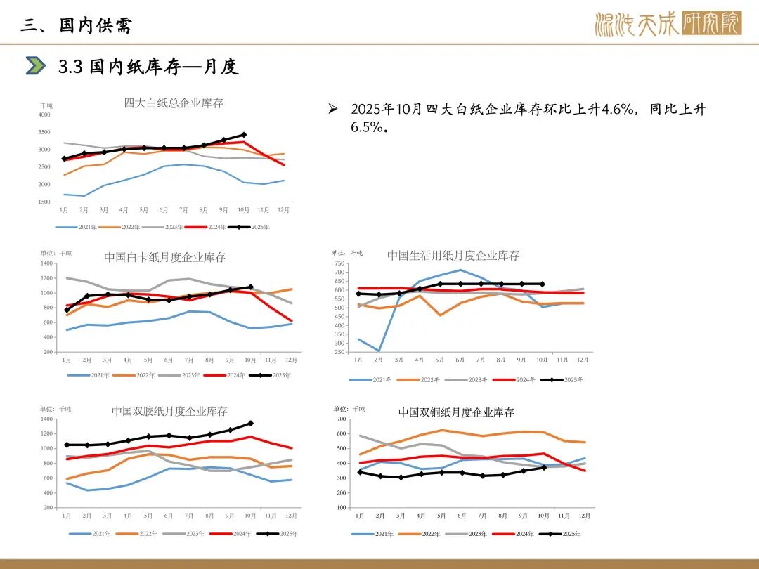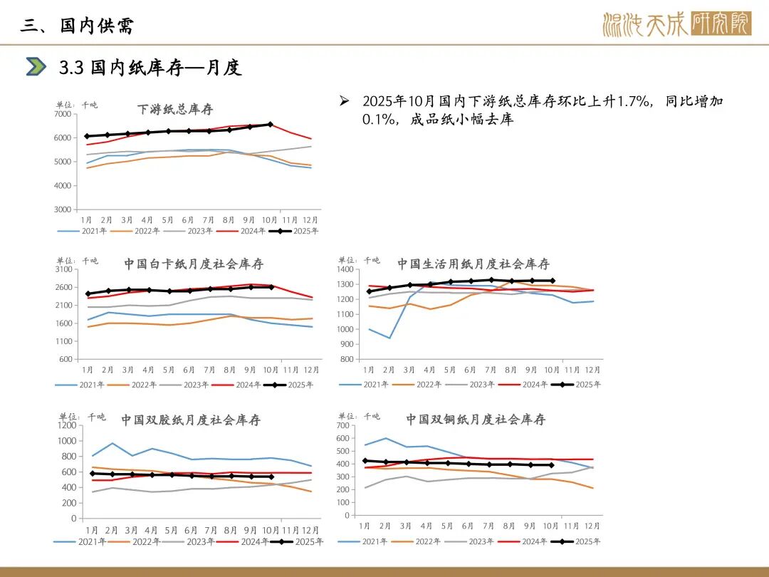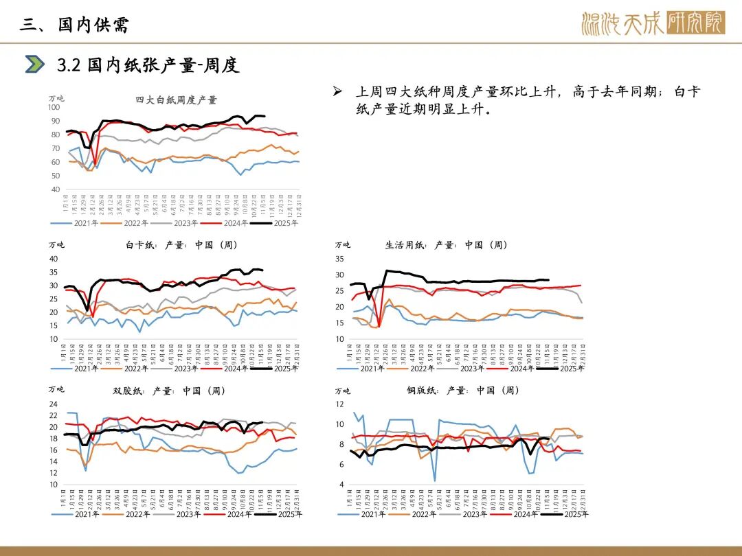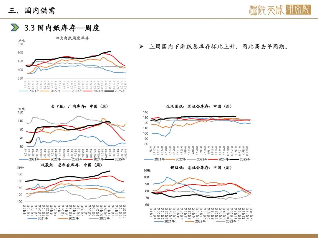 需求:本周下游开工,白卡纸环比-1.1%,双胶纸环比+0.9%,铜版纸环比-0.8%,生活纸环比-0.1%;