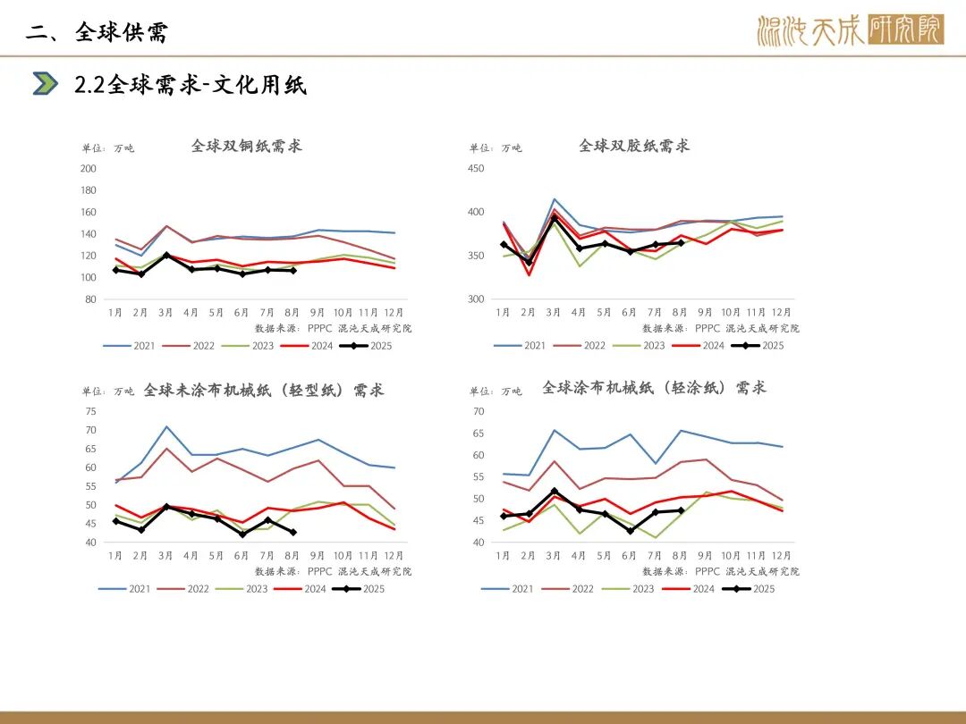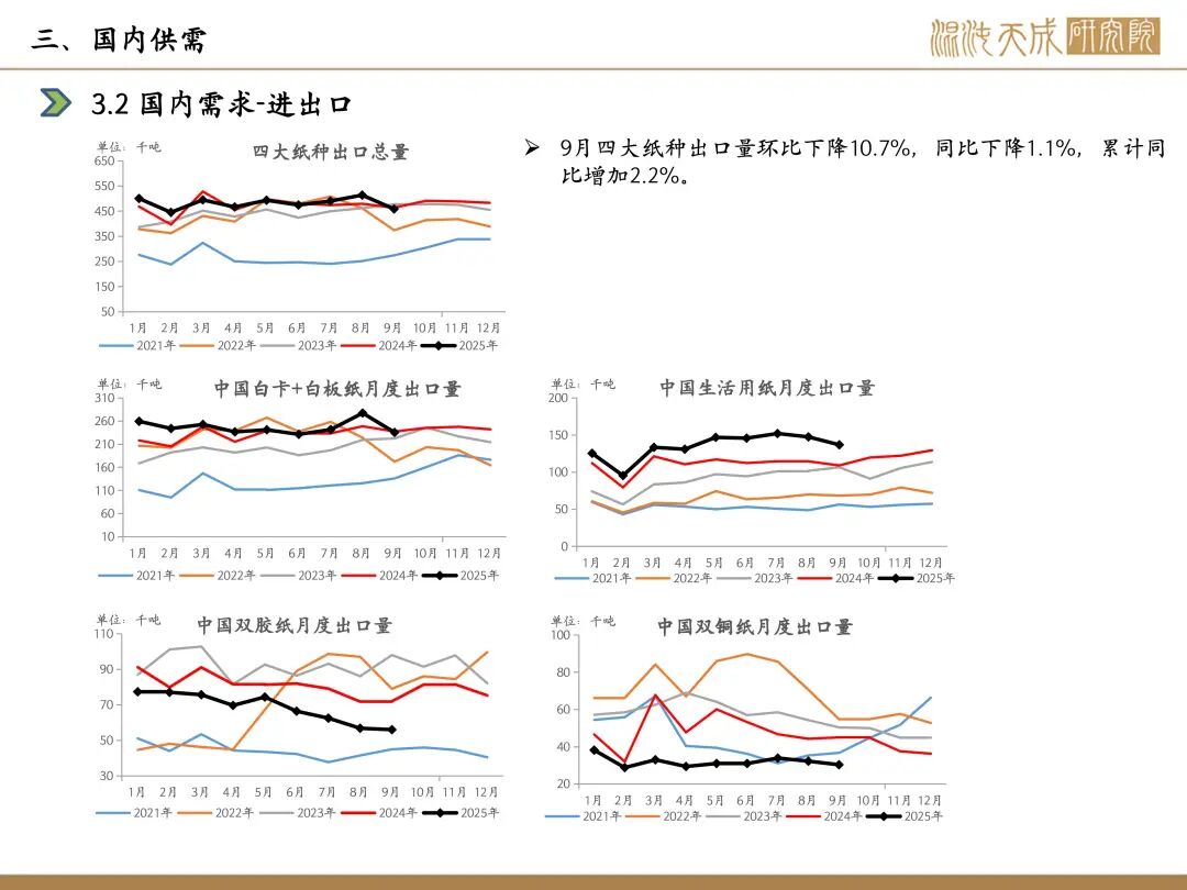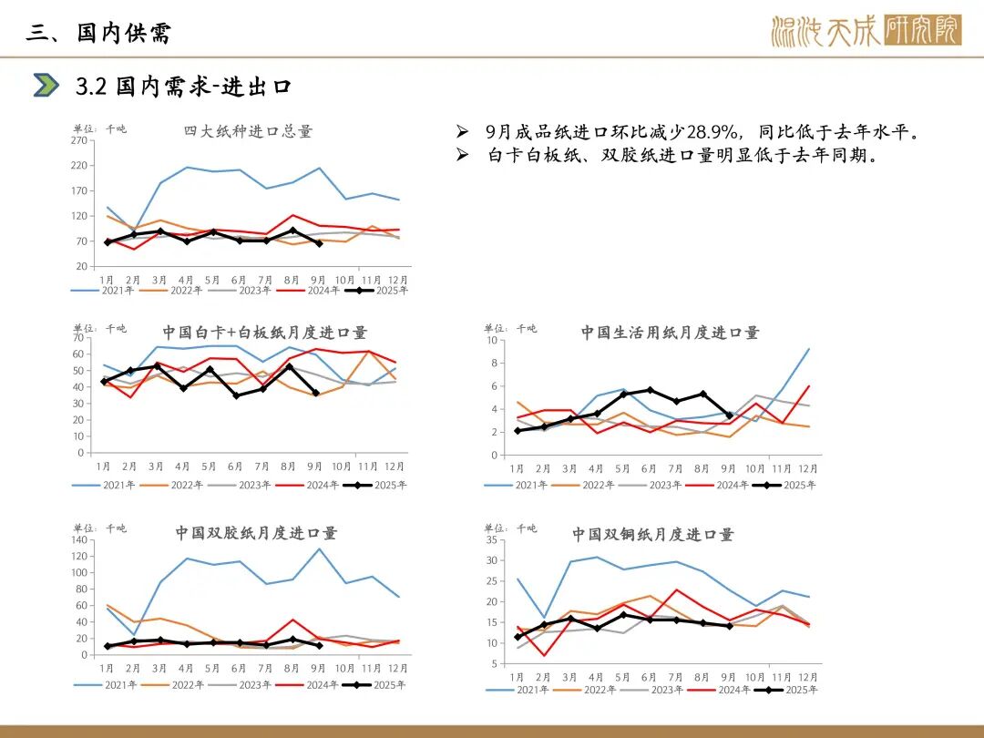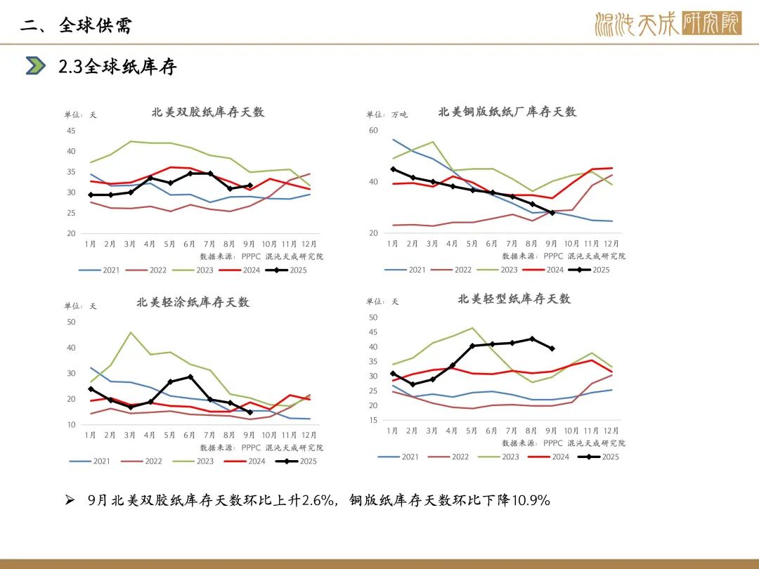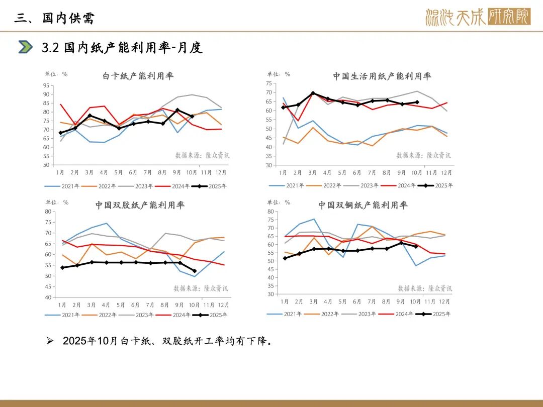 需求:本周下游开工,白卡纸环比-1.1%,双胶纸环比+0.9%,铜版纸环比-0.8%,生活纸环比-0.1%;