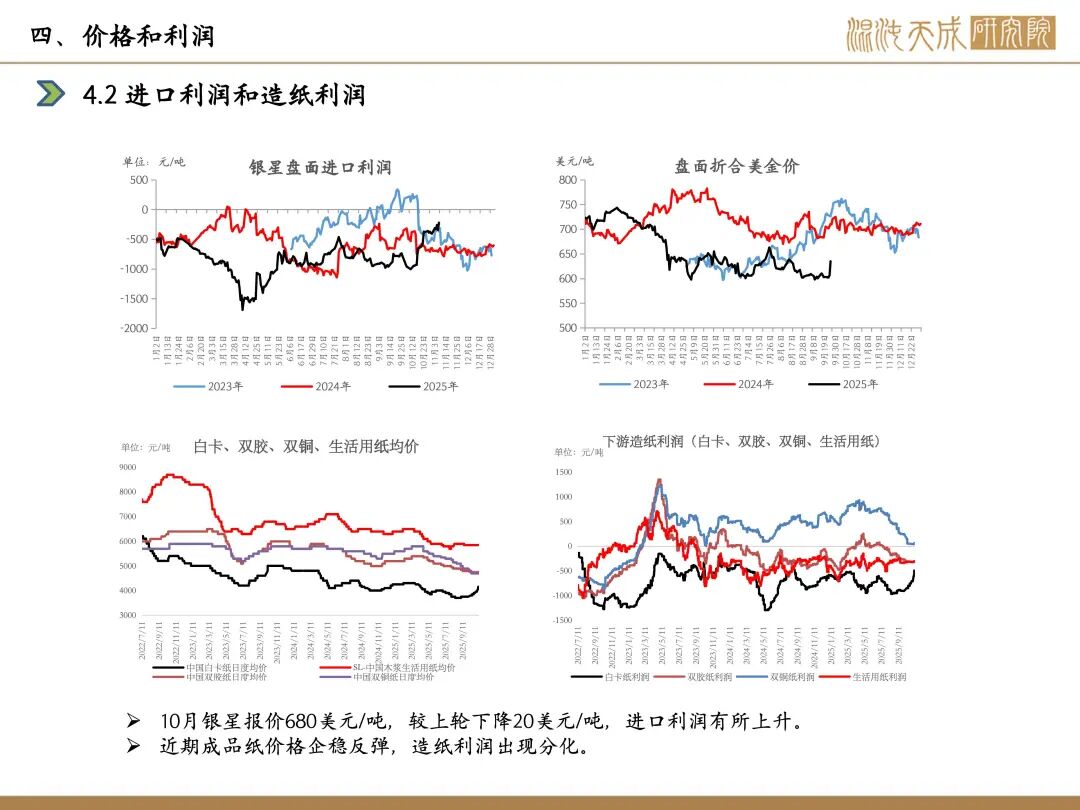 利润:10月银星680美元/吨,较上轮下降20美元/吨,造纸利润分化,白卡纸利润大幅回升,双铜纸、双胶纸利润下降。