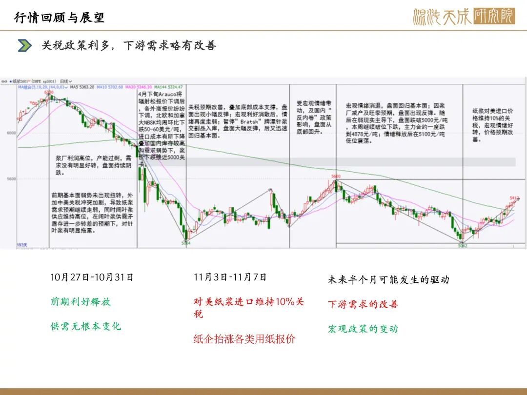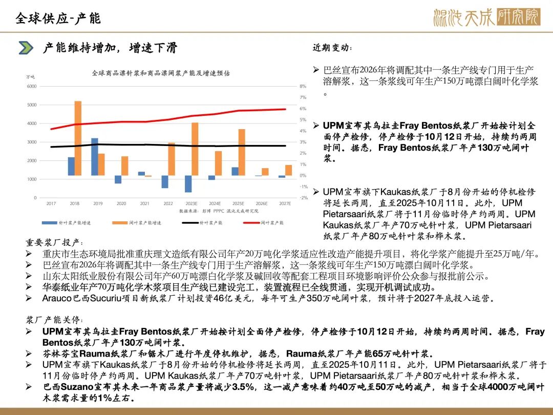 有限公司年产20万吨化学浆适应性改造产能提升项目,将化学浆产能提升至25万吨/年;海外市场,巴丝宣布2026年将调配其中一条生产线专门用于生产溶解浆,这一条浆线可年生产150万吨漂白阔叶化学浆;需求端,本周下游开工有所回升,相比节前下游开工略有改善,值得注意的是纸企抬涨各类用纸报价,对纸浆价格起到支撑作用;综合来看,新产能陆续投放,终端需求有所改善,原料方面,辐射松价格上涨从原料端利多浆价;宏观方面,纸浆对美进口价格维持10%的关税,宏观情绪有所好转。