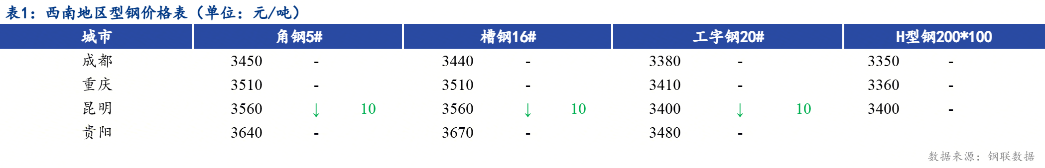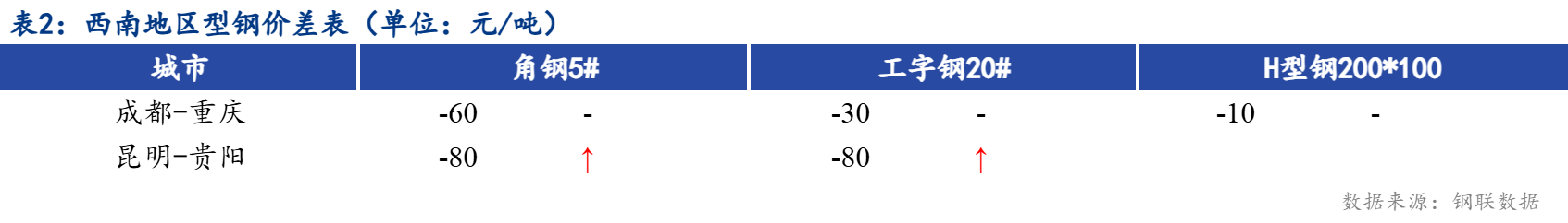 成都与重庆角钢价差不变,工字钢价差不变,H型钢价差不变;昆明和贵阳角钢价差扩张,工字钢价差价扩张。