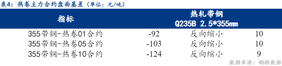 11日市场热卷01合约与唐山355带钢价差反向缩小10元/吨,热卷05合约与唐山355带钢价差反向缩小10元/吨。