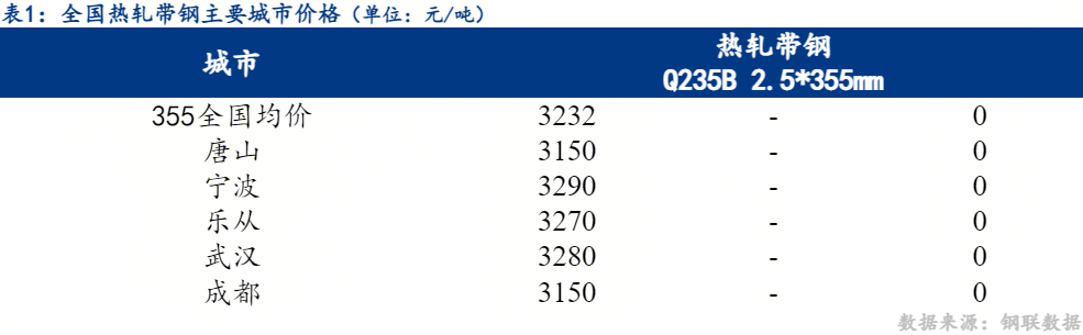 10日热轧带钢全国主要城市价格持稳,截至发稿时2.5*355mm热轧带钢均价3232元/吨,较昨稳。其中2.5*355mm主要城市报价为唐山3150元/吨,宁波3290元/吨,乐从3270元/吨。