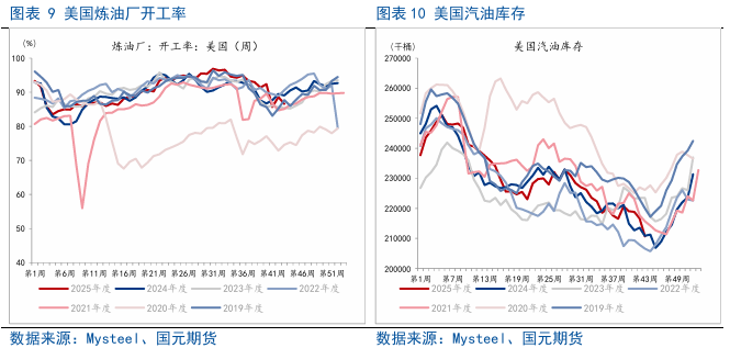 从库存情况来看,美国能源信息署(EIA)最新发布的数据显示,截至10月24日当周,美国全口径原油库存(含战略储备)总量8.25063亿桶,比前一周下降632.5万桶;商业原油库存量4.15966亿桶,比前一周下降685.8万桶;汽油库存总量2.10738亿桶,比前一周下降594.1万桶;馏分油库存量为1.12189亿桶,比前一周下降336.2万桶。当前美国商业原油库存较去年同期低2.24%,较五年均值低6%;汽油库存同比微降0.06%,较五年同期水平低3%;馏分油库存同比回落0.6%,较五年均值低8%。