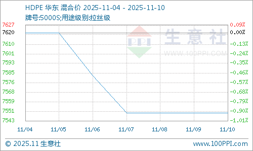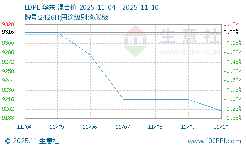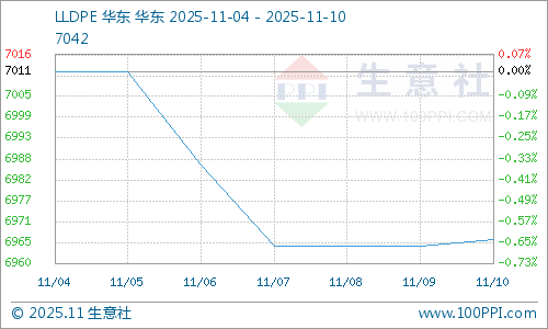 据生意社商品行情分析系统监测,LLDPE(7042)11月4日均价7011元/吨,11月10日均价在6966元/吨,下跌0.64%。LDPE(2426H)11月4日均价9316元/吨,11月10日均价在9200元/吨,下跌1.25%。HDPE(2426H)11月4日均价7620元/吨,11月10日均价在7550元/吨,下跌0.92%。