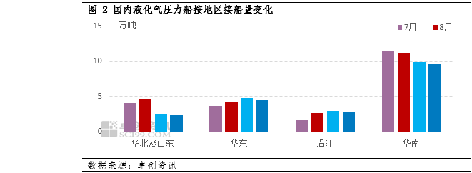 通过接船地来看,华北及山东接船量维持偏少状态,因炼厂以及码头丁烷资源不足,流入明显减少,当地深加工企业资源转向当地周边,而华南接船量逐月下滑,一方面因北方南下资源减少,一方面因当地卖方装船量也有下降;沿江及华东接船量相对平稳,其中沿江主要因武汉乙烯对LPG需求较为旺盛,而华东当地主要受醚后碳四以及丁烷资源需求提振。