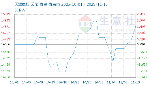 据生意社商品行情分析系统,近期(11.1~11.13)国内天然橡胶现货市场行情震荡小幅回暖,截止到11月13日我国天然橡胶市场现货胶行情在14883元/吨左右,较月初的14750元/吨上涨了0.90%,较周期内低点14466元/吨上涨了2.88%。受天胶原料成本支撑及需求刚需支撑,天然橡胶小幅回暖。但港口天胶库存微幅增加,对天胶行情有一定偏空影响。截至11月13日青岛地区24年广垦、宝岛、海宝全乳胶青岛地区主流报14800~15100元/吨。