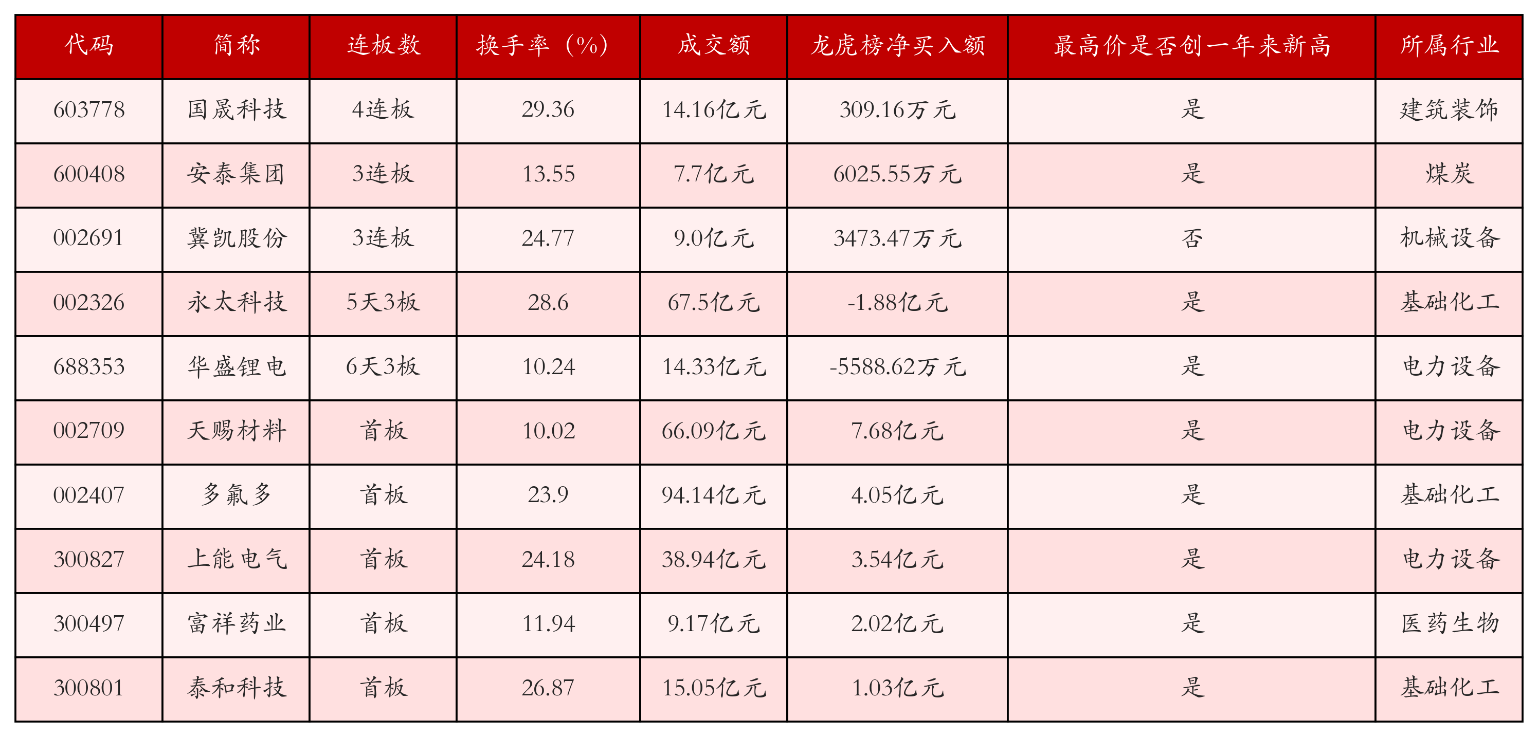 上涨1.78%,收于13476.52点,创业板指上涨2.55%,收于3201.75点。今日沪深两市A股共计106只涨停,综合当前连板数以及当日龙虎榜数据,其中较为强势的前三只个股分别为:国晟科技(603778)、安泰集团(600408)与冀凯股份(002691)。今日强势个股前10位具体数据见下表: