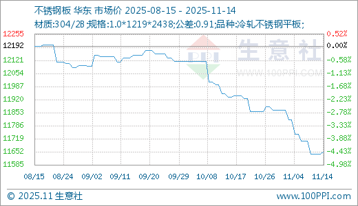 据生意社价格监测,本周不锈钢价格基本平稳。截止11月14日,现货304/2B不锈钢平板1.0*1219*2438(公差0.91)的日均价为现报价11650元/吨,较周初上涨0.07%,同比下跌7.49%。