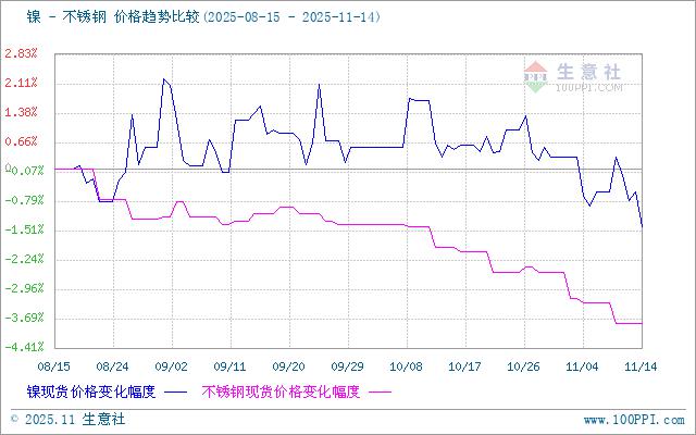 据生意社价差分析工具显示,镍和不锈钢价格走势相似,近期整体走势都是下跌。
