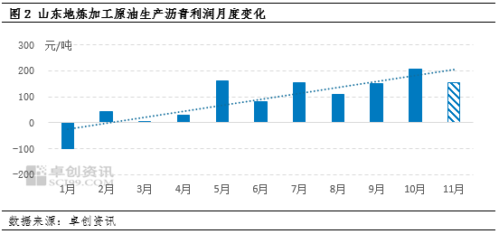 截至11月10日,11月份以来沥青加工原油生产沥青的平均利润仍在154.21元/吨。从月度利润水平来看,11月份的沥青生产利润虽然不及10月份,但是仍处在年内的偏高水平。