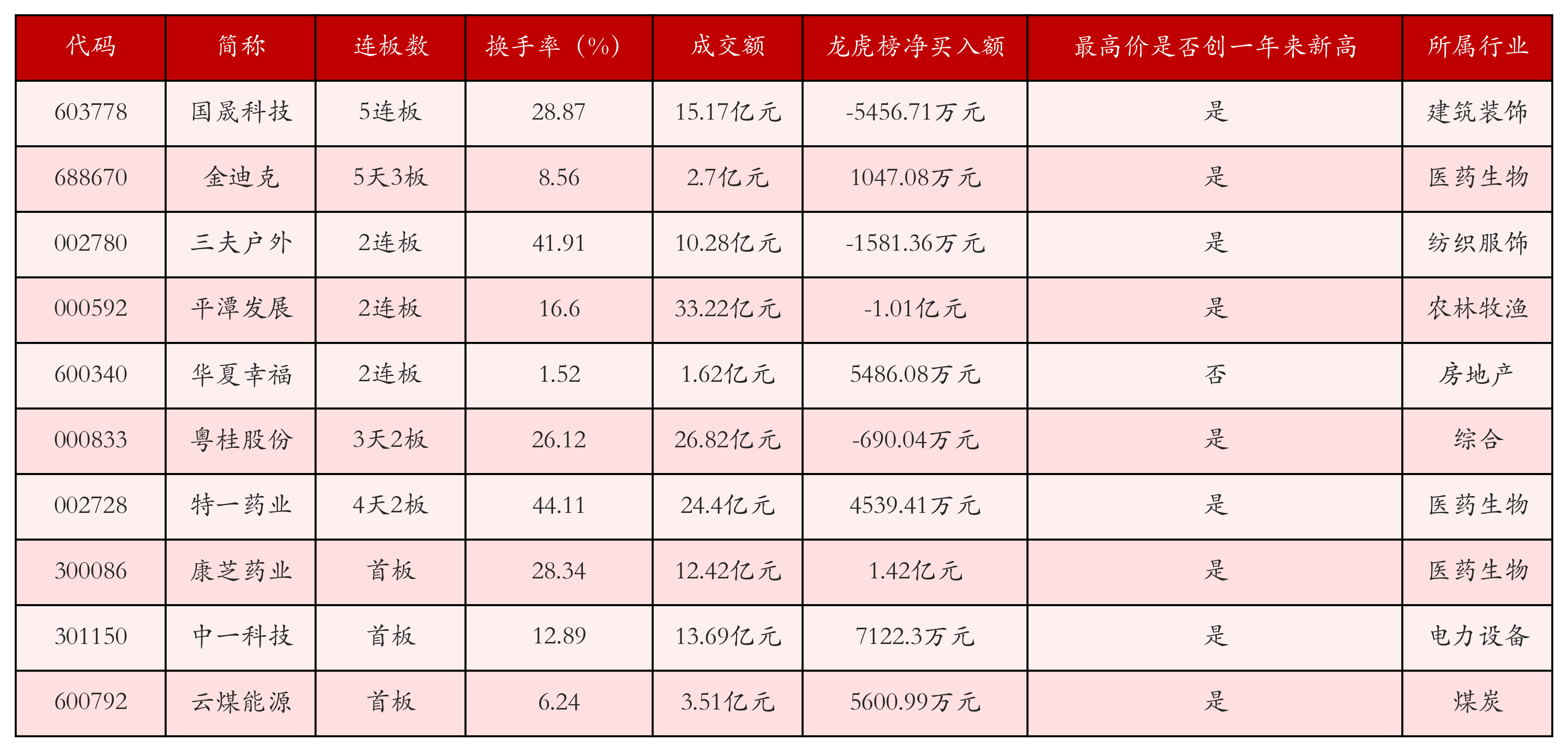 下跌1.93%,收于13216.03点,创业板指下跌2.82%,收于3111.51点。今日沪深两市A股共计90只涨停,综合当前连板数以及当日龙虎榜数据,其中较为强势的前三只个股分别为:国晟科技(603778)、金迪克(688670)与三夫户外(002780)。今日强势个股前10位具体数据见下表: