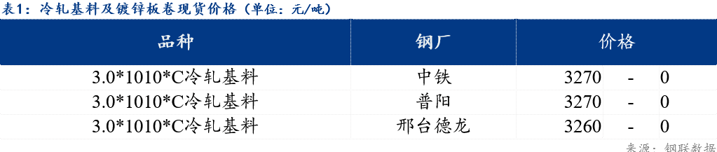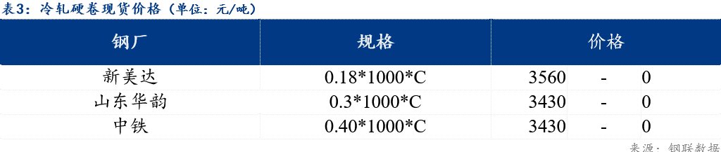镀锌板卷0.3*1000*C山东华韵报价4150元/吨,较上个交易日价格持平;冷轧硬卷0.18*1000*C新美达出厂报价3560元/吨,较上个交易日价格持平;冷轧基料3.0*1010*C中铁报价3270元/吨,较上个交易日价格持平。