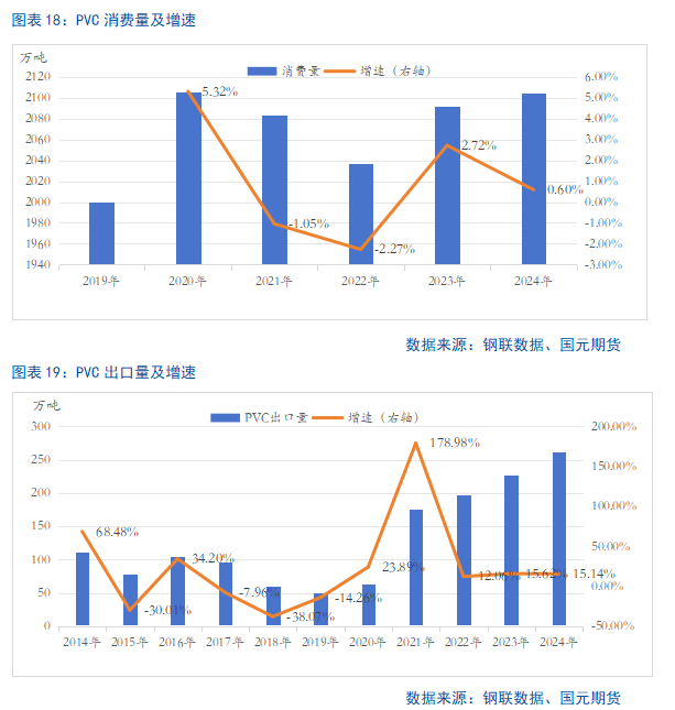 值得关注的是,出口市场已成为近年来拉动PVC消费的重要力量。聚氯乙烯出口量从2020年的63万吨显著增长至2024年的262万吨,出口规模的持续扩张,在一定程度上缓解了内需增长不足的压力,成为行业运行中的一大亮点。