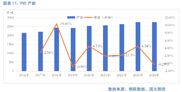 从PVC市场来看, 近年来该品种的产能扩张节奏显著放缓,增速远低于聚丙烯和聚乙烯等其他塑料品种。根据钢联数据统计,2020年至2024年间,我国聚氯乙烯产能年均增速为2.56%,且增速在2024年已降至-0.29%,呈现收缩态势;相比之下,聚氯乙烯产能整体增长更为平缓,至2024年全国PVC总产能达到2754万吨。而2025年PVC又呈现出集中投产,已经投产200万吨左右,产能增速已超过5%。