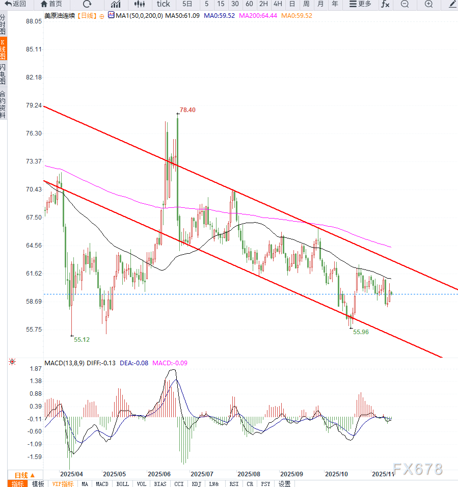 从日线级别来看,美原油处于明显的弱势结构中,但短期存在技术性反弹需求。WTI价格在近期持续位于九日指数均线下方运行,显示空头力量仍占主导,但K线在59美元附近形成阶段性支撑带,并出现连续下影线,反映低位买盘逐步增强。