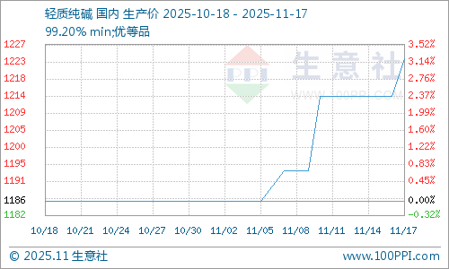 据生意社商品分析系统显示,11月17日轻质纯碱市场均价在1224元/吨,与11月10日价格1214元/吨相比涨幅0.82%,纯碱价格走势上涨。