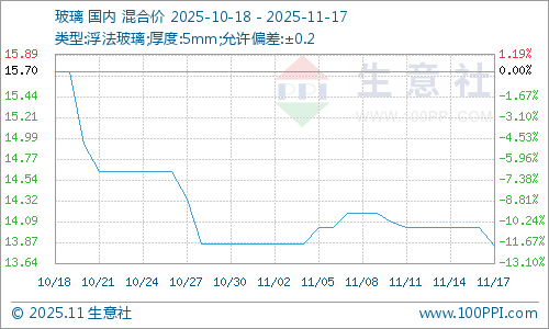 需求方面:据生意社商品分析系统显示,近期玻璃行情偏弱下行,截止11月17日市场均价在13.83元/平方米,与11月10日价格14.08元/吨相比跌幅1.78%。玻璃市场开工率小幅减少,下游需求表现一般,市场采购氛围低迷,企业出货不畅,玻璃库存累积,业者心态偏弱,玻璃价格行情走跌。