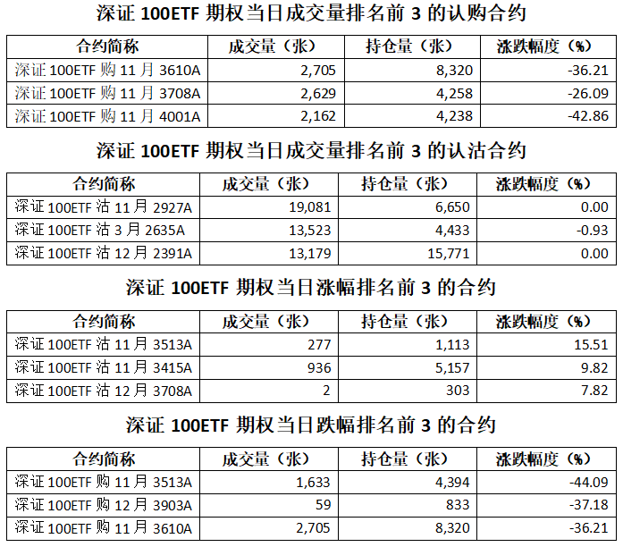 深证100ETF期权总成交面额28.36亿元,增加65.92%,期现成交比为0.02,权利金成交额0.11亿元;期权总成交量92,949张,增加65.53%,其中认购期权成交量18,942张,认沽期权成交量74,007张,认沽认购成交比率为3.91(上一交易日认沽认购成交比率为2.95)。