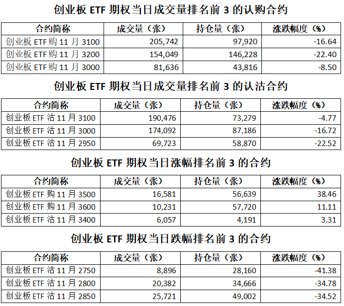 创业板ETF期权总成交面额481.40亿元,减少1.59%,期现成交比为0.29,权利金成交额8.75亿元;期权总成交量1,572,666张,减少0.62%,其中认购期权成交量758,926张,认沽期权成交量813,740张,认沽认购成交比率为1.07(上一交易日认沽认购成交比率为1.05)。