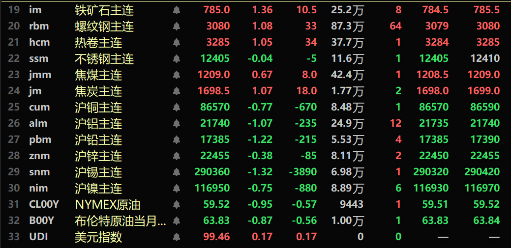黑色系多飘红,铁矿涨1.36%,螺纹涨1.08%,热卷涨1.05%,不锈钢微跌。双焦方面:焦煤主力合约