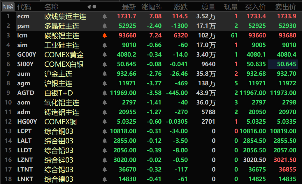 此外,铸造铝主连期货跌1.27%,氧化铝主连跌1.41%。碳酸锂主连涨7.24%,工业硅主连跌0.66%。多晶硅主连跌2.4%。