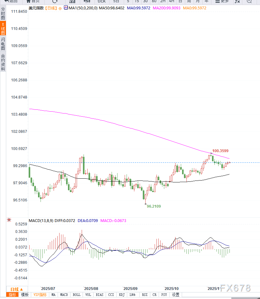 上方阻力100.00为强压力区域,突破后可看向100.50–100.80;下方支撑99.20–99.00区间构成短线防守位,若跌破恐进一步回探98.60与98.20。技术面总体偏中性,等待重大数据催化方向。