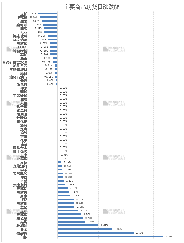 11月19日,卓创资讯监测商品现货市场23种上涨、21种下跌,18种企稳。贵金属板块表现强劲。白银、黄金分别以3.84%、2%涨幅居前;能化板块延续分化,丙烯、苯乙烯分别上涨1%和0.93%,甲醇、纯苯、PVC粉承压下跌;有色金属