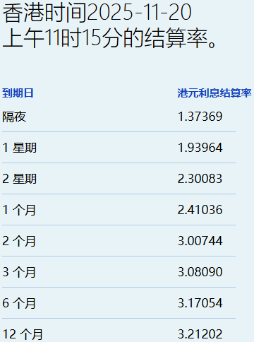 11月20日,港元拆息全线上升,而与楼按相关的一个月拆息终止五连跌,报2.41036%,升12.667基点;反映银行资金成本的三个月拆息报3.0809%,升2.316基点。