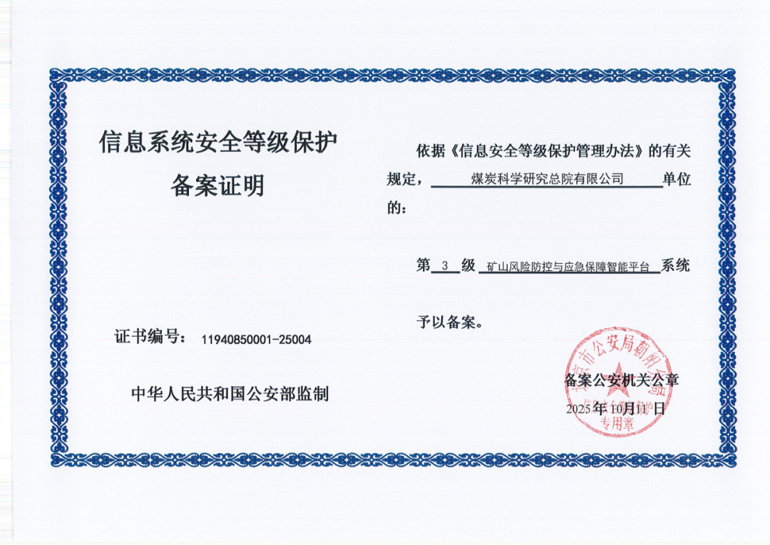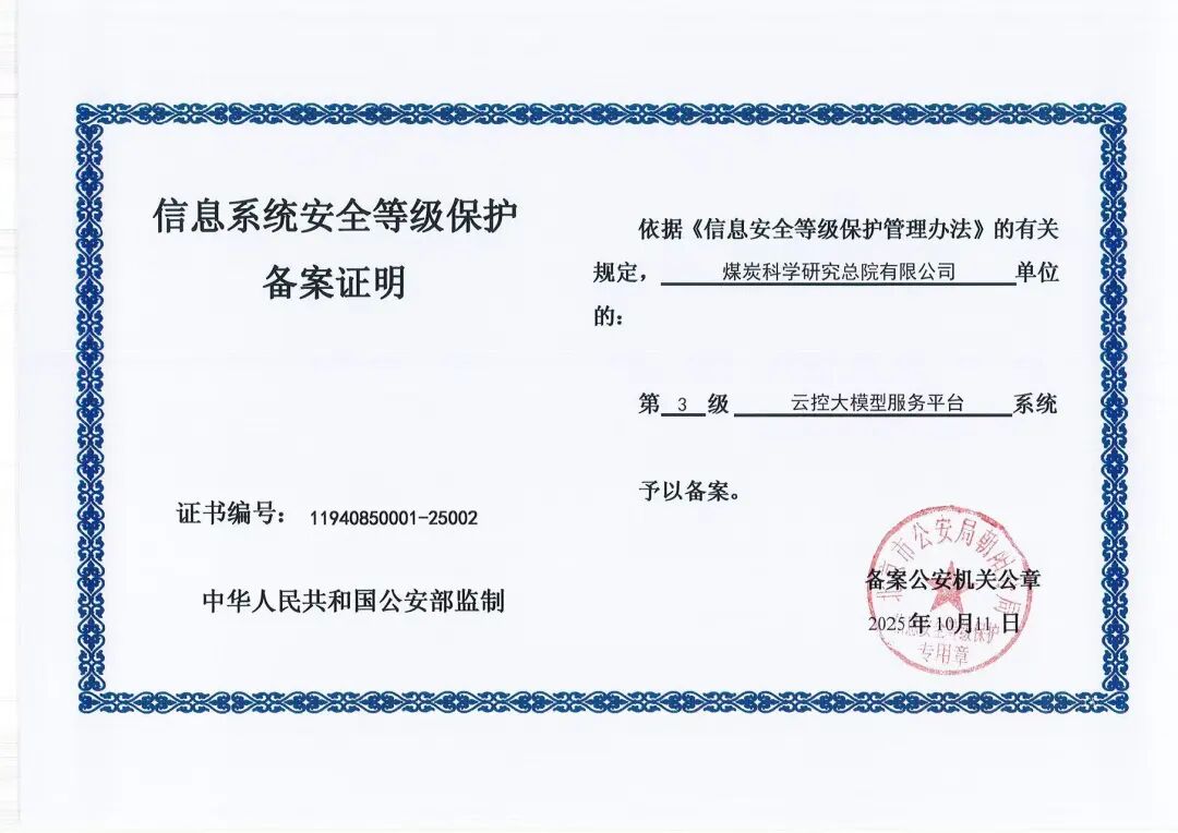 大模型成功通过国家信息系统安全等级保护三级备案,标志着煤炭共性技术研究院矿山人工智能从“科技研发”迈入“多领域安全应用”的新阶段。