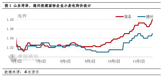11月上旬小麦价格经过短暂回调后,中旬再度上涨,部分地区面粉企业小麦收购价格已高于10月底的高价,以山东菏泽为例,截至11月18日规模面粉企业小麦净粮收购价格在1.274-1.282元/斤,较上涨前(11月14日)累计调涨幅度在0.01-0.02元/斤,整体涨势增强。