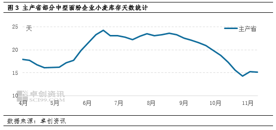 自10月份面粉企业小麦库存持续消化后,平均库存水平已处于相对偏低状态,部分样本企业小麦库存仅在10天以内,11月上旬在价格下跌的过程中,部分企业适量补库,但总体补库量并不大,且有部分厂家到货量不能满足生产的情况下,仍有搭配库存生产的情况,因此可以看到11月近两周样本企业平均小麦库存天数并未明显回升。截至11月14日,卓创资讯监测的主产省部分中型面粉企业小麦库存天数为15.08天,环比上周减少0.13天,因此部分企业仍有补库及提价促量的需求,价格提涨相对集中。