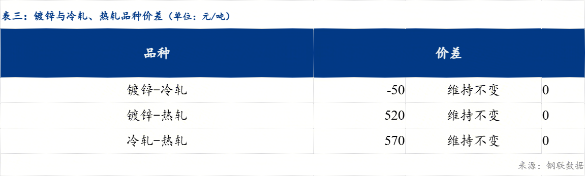 重庆、上海地区冷轧板卷区域价差维持不变0元/吨;重庆、广州冷轧板卷区域价差正向缩小10元/吨。重庆、上海镀锌板卷区域价差维持不变0元/吨;重庆、广州镀锌板卷区域价差维持不变0元/吨。镀锌、冷轧品种价差维持不变0元/吨;镀锌、热轧品种价差维持不变0元/吨;冷轧、热轧品种价差维持不变0元/吨。