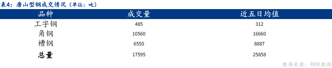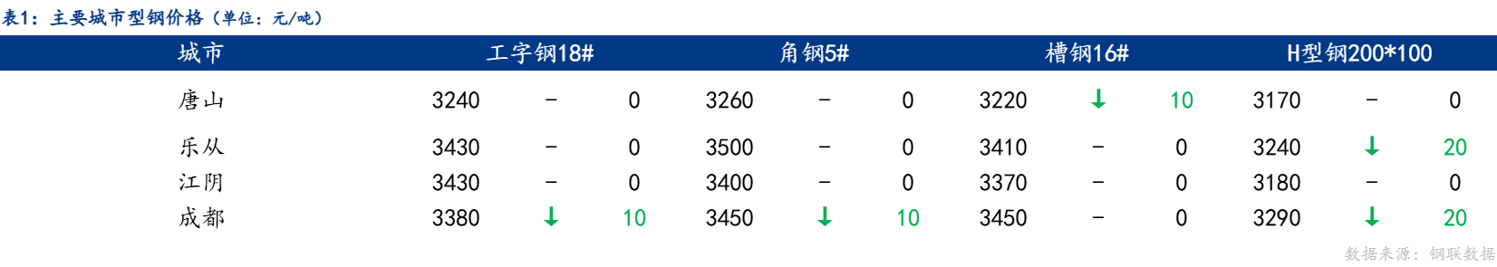 从区域价差来看,乐从、江阴市场工字钢、角钢与唐山价差维持不变;成都市场工字钢、角钢与唐山价差正向缩小;乐从、江阴、成都市场槽钢与唐山价差正向扩大。