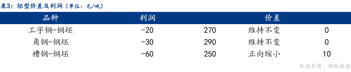 从坯型价差来看,工字钢、角钢与钢坯价差维持不变,槽钢与钢坯价差正向缩小。