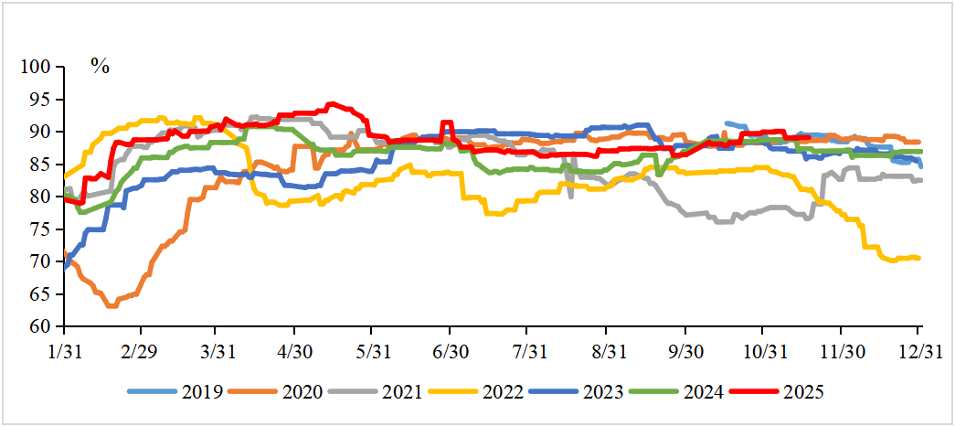 2025年国内聚酯行业总产量有望突破9000万吨,同比增长9%。2025年聚酯平均开工率维持在88.29%的高位,对PTA形成刚性需求支撑。聚酯原料低价下长丝FDY、瓶片、短纤产品现金流有所修复,但聚酯内部结构分化显著,瓶片加工费修复至335元/吨左右,库存表现健康;长丝、短纤受终端需求拖累,产销情况持续偏弱,企业通过促销手段被动去库。截至11月13日聚酯负荷降至90.3%附近,聚酯高开工维持。终端开工情况来看,本周江浙地区原料备货有所下降,织造端新订单氛围出现局部走弱。截止11.13江浙终端开工有所下降,江浙加弹综合开工率88%(+2%),江浙织机综合开工率至74%(-1%),江浙印染综合开工率维持77%(-3%),坯布库存虽较前期有所去化,但仍高于历年同期水平。