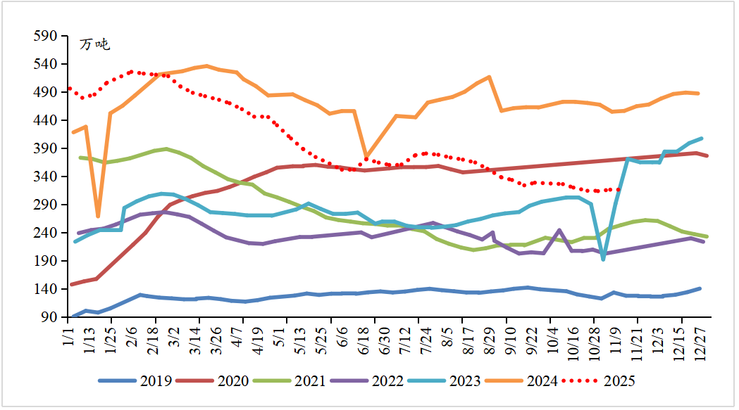 2025年是PTA产能投放周期的尾声,全年新增产能计划达870万吨,年末总产能预计达到9171.5万吨,产能增速高达9.5%。新产能虹港石化、三房巷,独山能源3#、4#已顺利投放,现货流通性偏宽松。本周PTA加工差略有改善,周均在179元/吨。本周PTA社会库存量约在315.61万吨,11月以来PTA由去库转为小幅累库,从库存结构来看,聚酯工厂原料备货天数维持在13-14天左右库存结构相对合理,贸易环节库存压力较大,但PTA整体库存水平低于近2年同期水平,且低加工费下供应端存在检修降负预期,PTA整体库存压力不大。2025年11月12日,印度正式撤销对PTA及聚酯制品的BIS认证,预计四季度对印出口量将增加,有效缓解国内供应压力。若后续印度出口需求兑现,库存去化节奏有望加快。