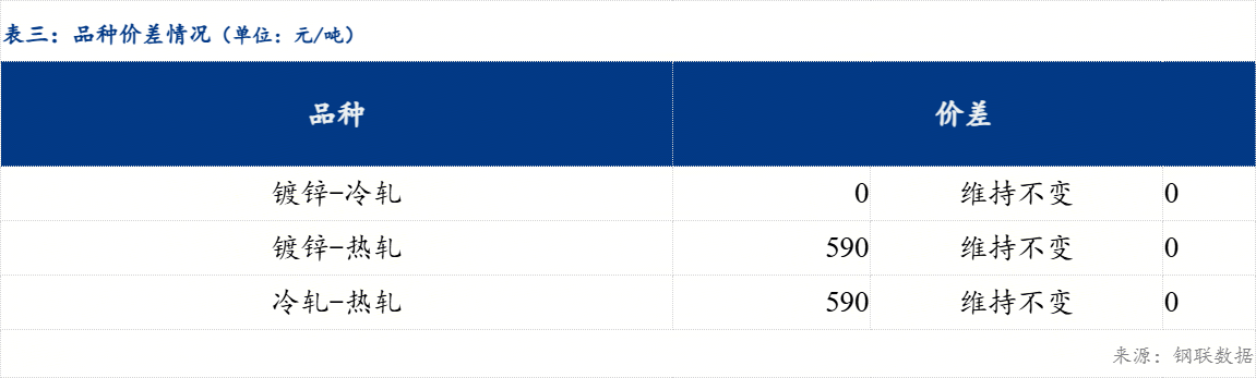 品种价差来看,现镀冷价差为0元/吨,较上一交易日维持不变;镀热价差为590元/吨,较上一交易日维持不变;冷热价差为590元/吨,较上一交易日维持不变。