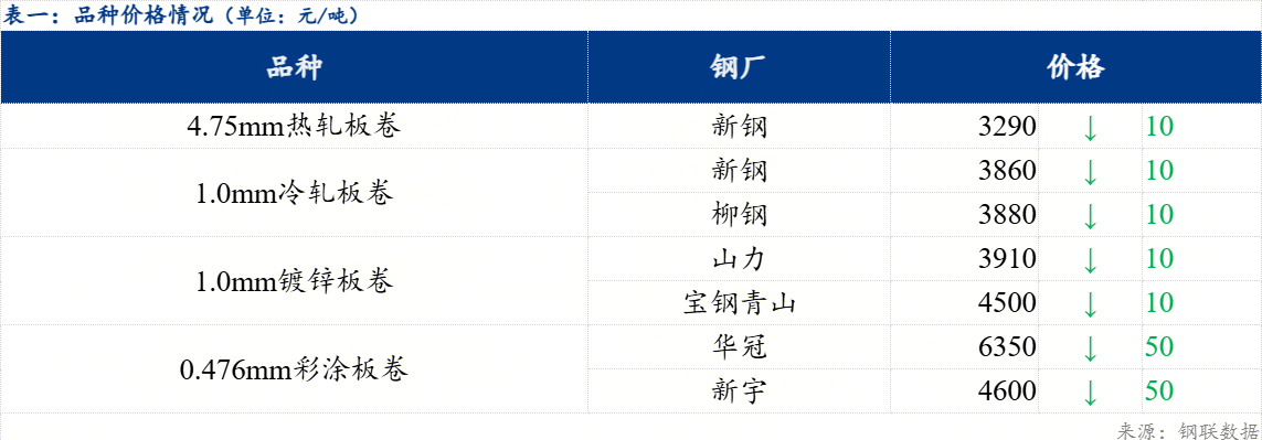 盘面震荡运行,原料热轧2601合约收盘价3270元/吨,较上一交易日基本持平,江西市场冷轧和镀锌板卷价格部分跌价。截止收盘,新余热轧新钢4.75mm报价3290元/吨,较上一交易日下跌20元/吨;新余冷轧新钢1.0mm报价3860元/吨,较上一交易日下跌10元/吨 ;南昌镀锌山力兴冶1.0mm报价3910元/吨,较上一交易日下跌10元/吨 ,南昌彩涂天津新宇0.476mm报价4600元/吨,较上一交易日下跌50元/吨 。