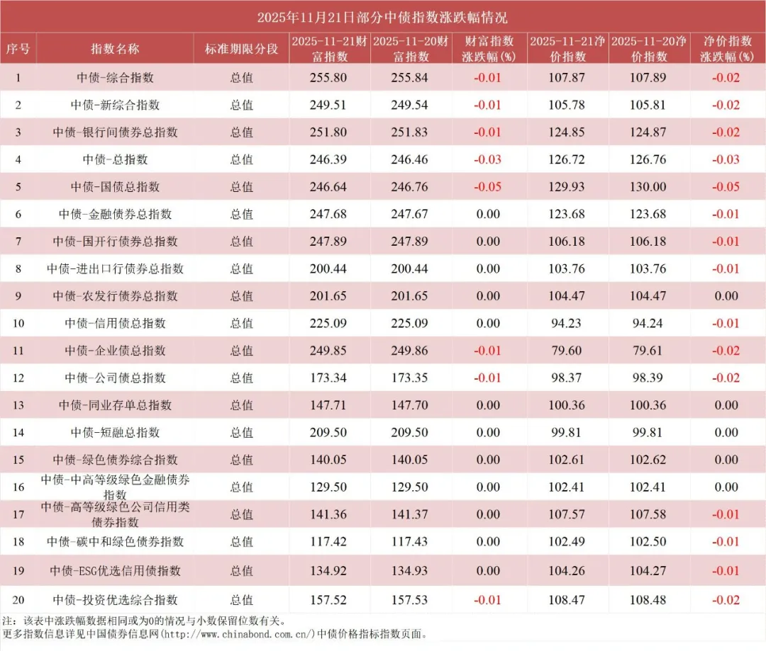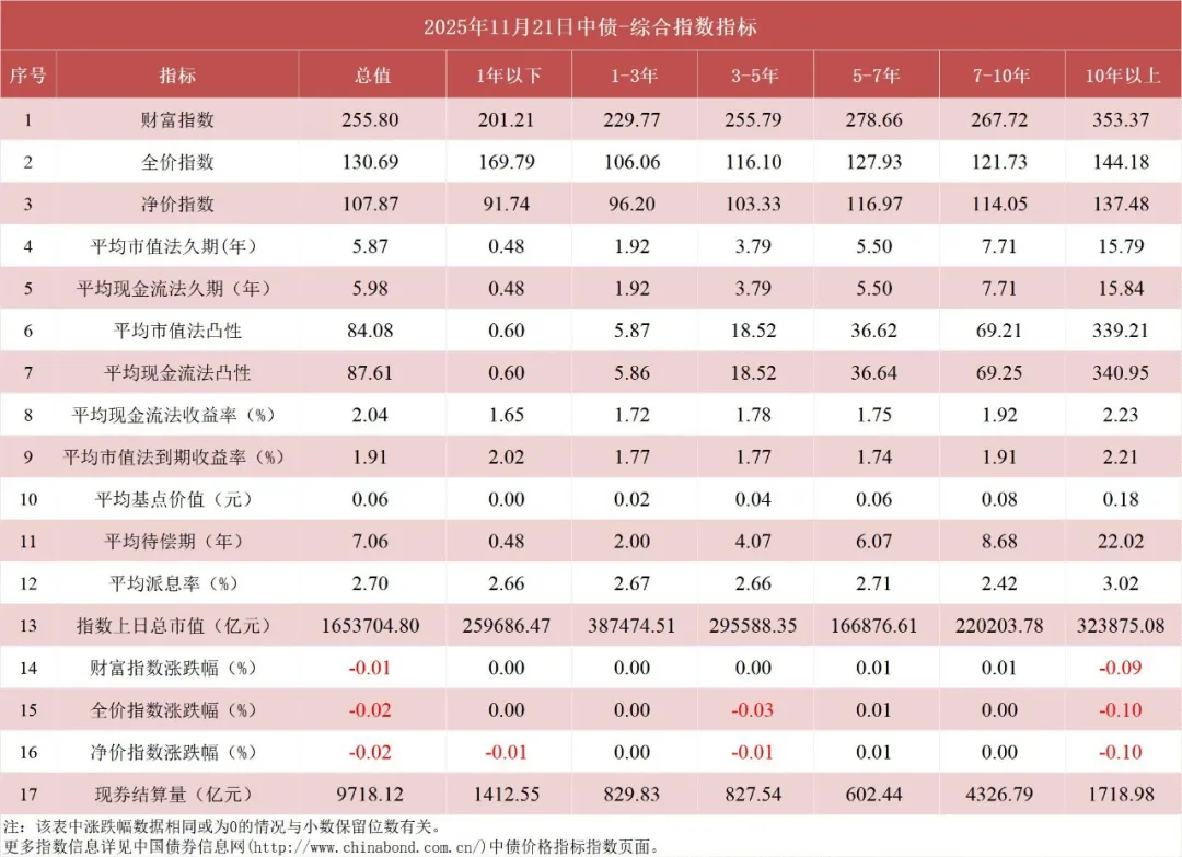 指数小幅波动,其中不包含利息再投资的中债综合指数(净价)107.8658,下跌0.0222%,而包含利息再投资的中债综合指数(财富)255.7996,下跌0.0149%,平均市值法到期收益率为1.9111%,平均市值法久期为5.8736。