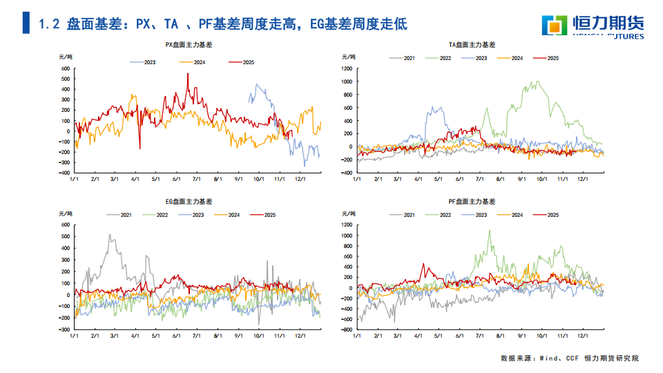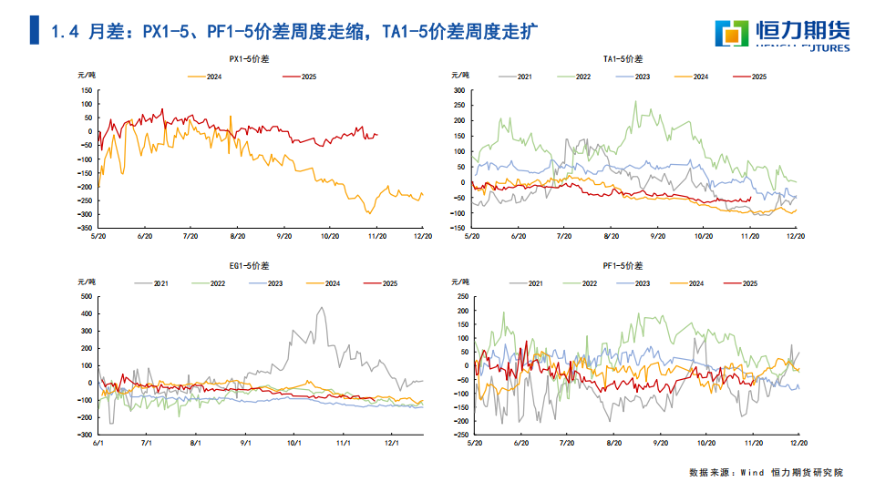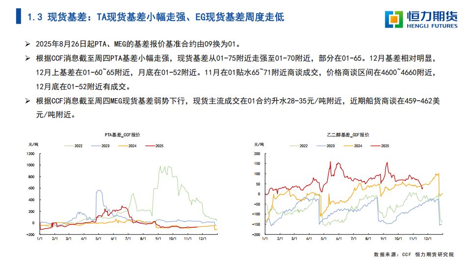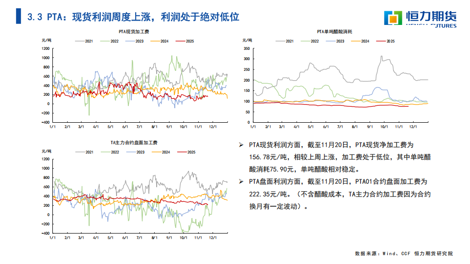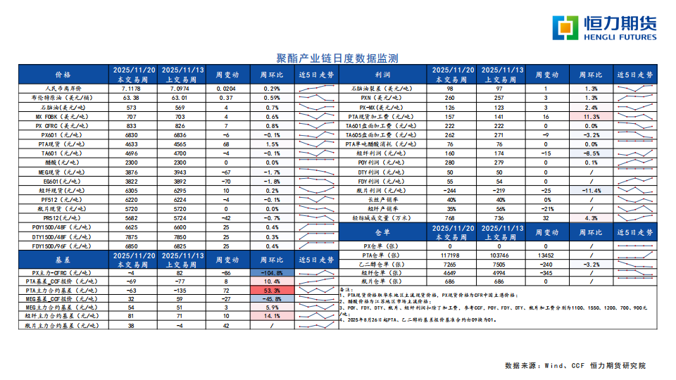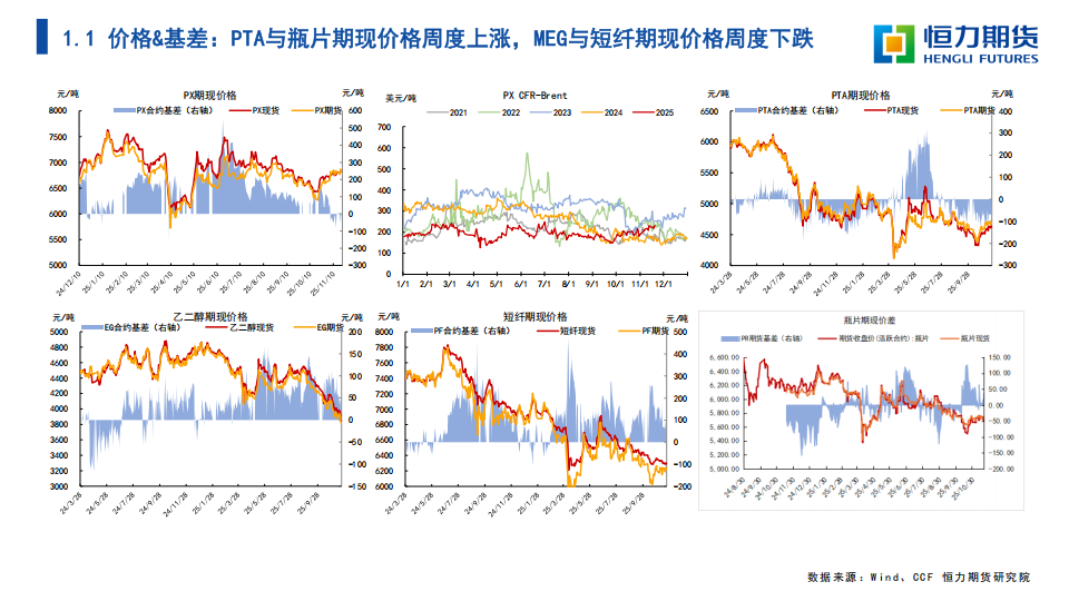 2、TA:开工边际下滑,成本和加工费小幅上涨。TA现货基差小幅走强,现货基差在01-69,11月货在01贴水65~71附近商谈。需求方面本周聚酯负荷高位微升,聚酯化纤周内产销小幅降低,终端需求“旺季”边际转弱。