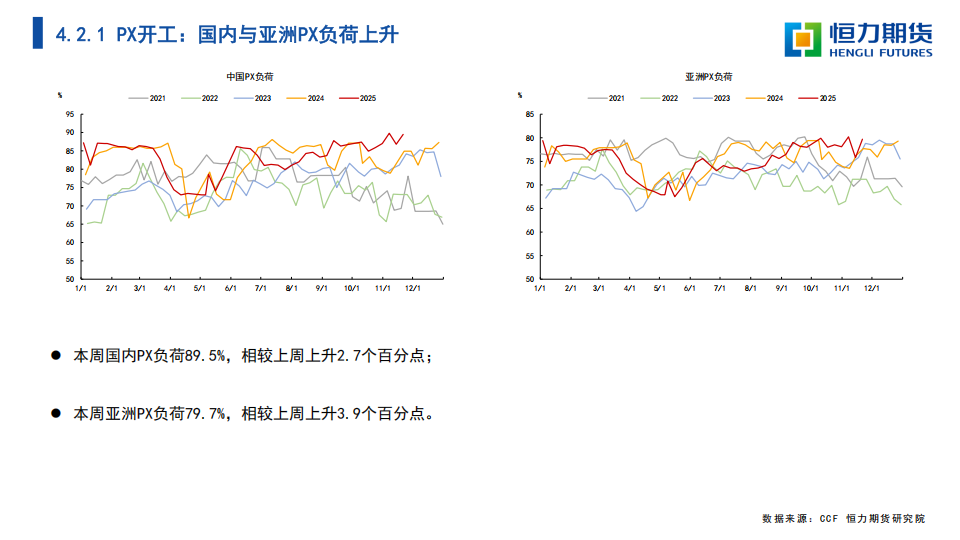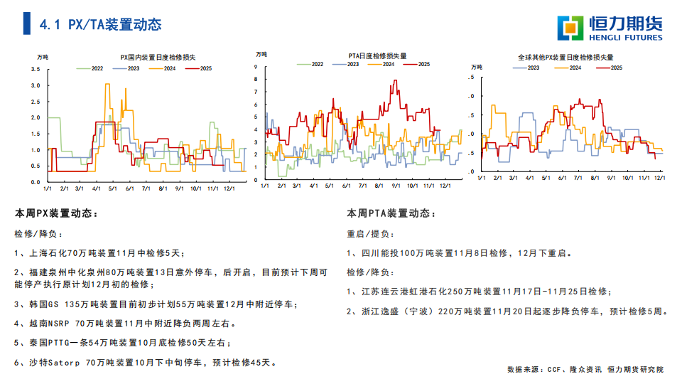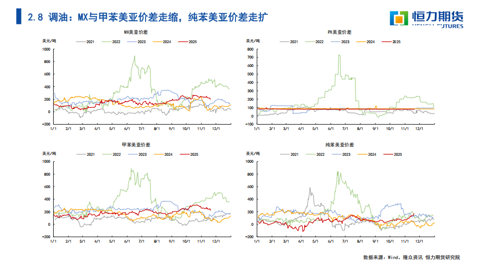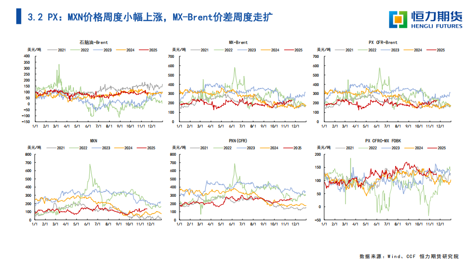 1、PX:国内宏观氛围偏暖。PXN维稳250-260美元/吨附近。终端需求走弱,PX负荷高位上升,短期内PX不会出现更多利空因素,且四季度保持去库格局,整体不宜过分看空。目前欧美汽油库存处于历史同期均值偏低水平,加之需求拉动,芳烃整体表现较强,MX美亚价差维持高位,提振亚洲PX价格。