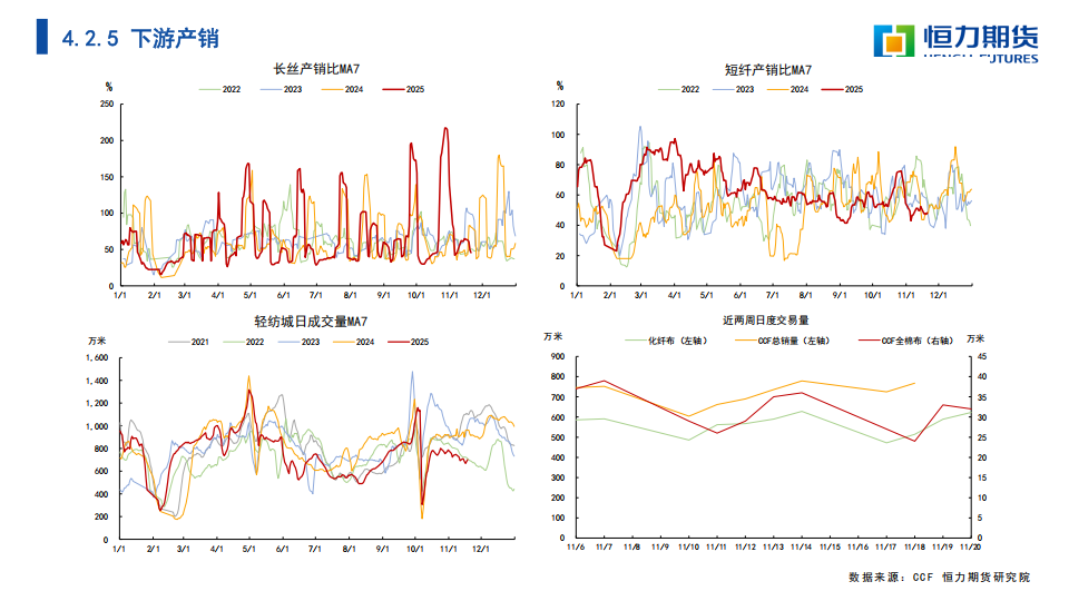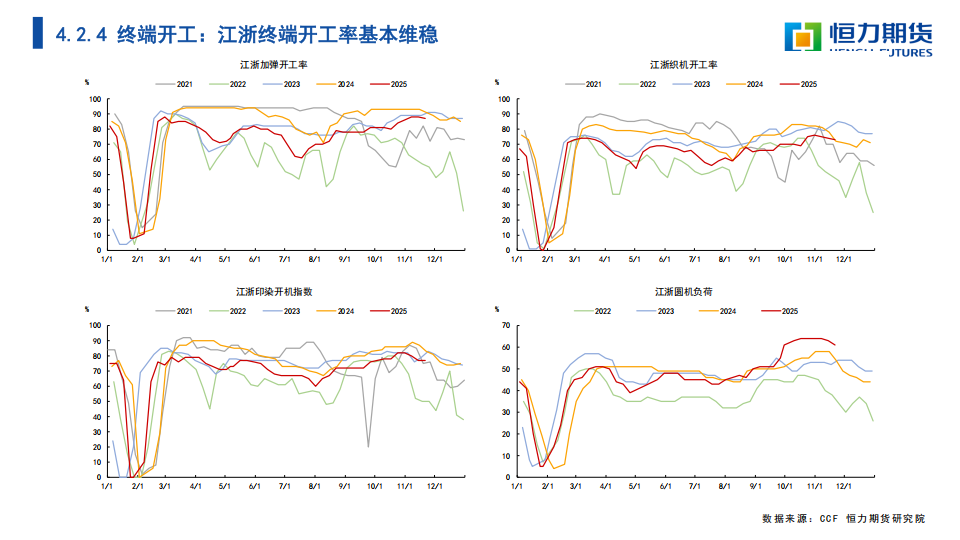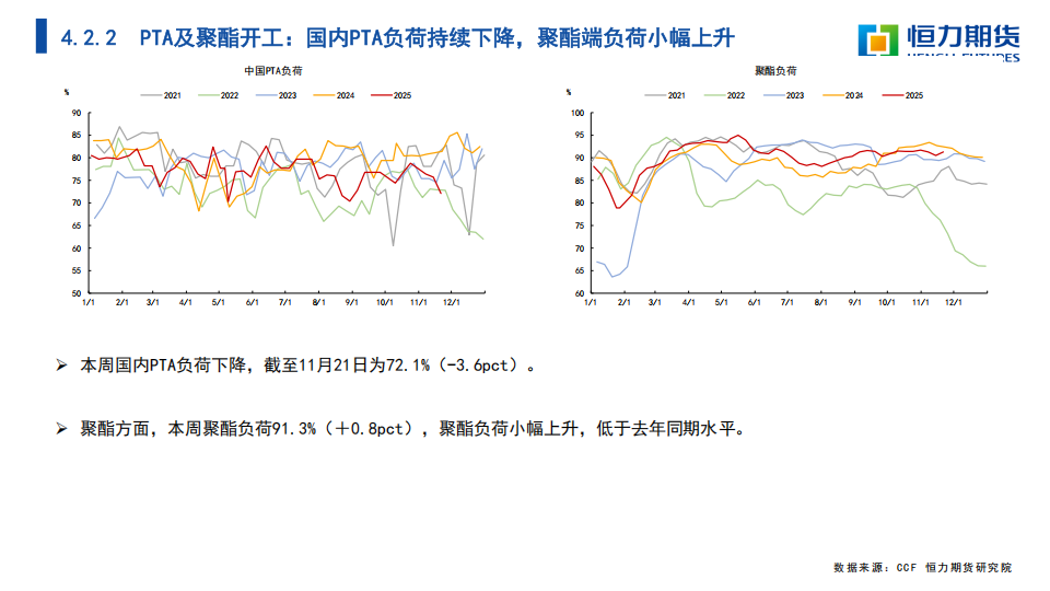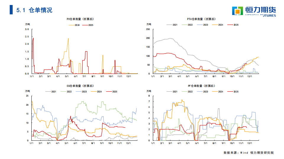 4、PF&PR:本周江浙终端开工率基本维稳,终端需求边际走弱。目前瓶片负荷上升至72.9(+2.0pct),仍处于相对低位。瓶片价格跟随原料成本波动为主,利润偏低,难有提升开工的驱动,预计后市偏弱整理,短纤负荷周度维持97.5%,处于高位。目前终端旺季订单逐步交付,织造端新订单乏力,工厂库存小幅累积。