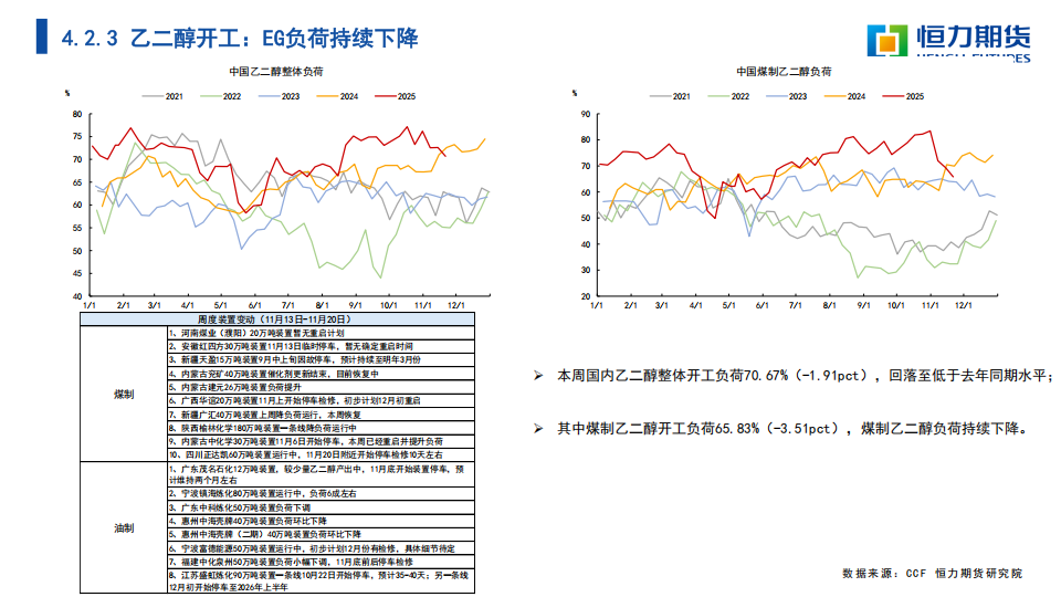 3、EG:截至周四乙二醇现货基差周度走低,主流成交在01合约升水28-35元/吨附近。乙二醇主港库存63.3万吨,周度上升,库存水平高于去年同期水平,仍处于相对低位。目前乙二醇供给高位回落,低于去年同期水平,从利润来看,煤制利润持续下降且低于去年同期水平。关注四季度装置情况。