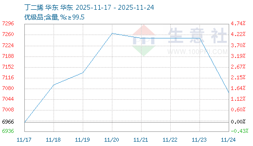 据生意社商品行情分析系统,本周期国内丁二烯市场震荡上行。2025年至11月17日至11月24日丁二烯自6966.67元/吨上调至7066.67元/吨,涨1.44%。本周期国内丁二烯市场先涨后跌整体上行,近期丁二烯市场走势偏强,供应面来看近期供应整体依旧偏宽松,随着价格走高后下游入市积极性明显减弱,加上合成橡胶市场近期走势偏弱,丁二烯市场走势转弱。