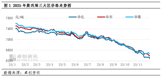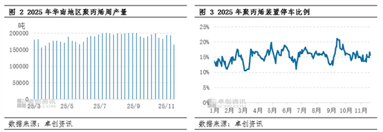 具体分析来看,华南区域PP拉丝再度成为国内最高价,并与华北、华东区域价差再度走扩,实质上与其区域内供需格局亦是密不可分,尤其是目前下游开工变动不大,供应端的变化对区域价格的影响更为明显。11月以来,虽广西石化二期新产能稳步释放产量,但区域内检修装置数量增加明显,自月初起,东莞巨正源全线120万吨装置、广东石化二期、中化泉州一线等相继停车检修,且广州石化1PP、3PP等装置仍处于停车中,此外月底茂名石化2PP预计仍有检修计划,区域检修损失量处相对高位。据卓创资讯数据统计,(20251114-1120)华南地区PP周产量在16.56万吨,较上周减少14.34个百分点,产量缩量较为明显。此外,区域内某生产企业由于前期超卖资源太多,交货速度较缓,在多重因素的影响下区域内拉丝、高熔纤维现货资源供应相对紧俏,因此华南区域内价格表现强于其他区域。总的来看,当前华南地区凭借区域内供应缩量形成的底部支撑,价格跌幅放缓,且与其他地区价差呈现逐步走扩态势。截至11月20日,其与华北拉丝的价差已扩大至190元/吨,与华东拉丝的价差亦扩至95元/吨。